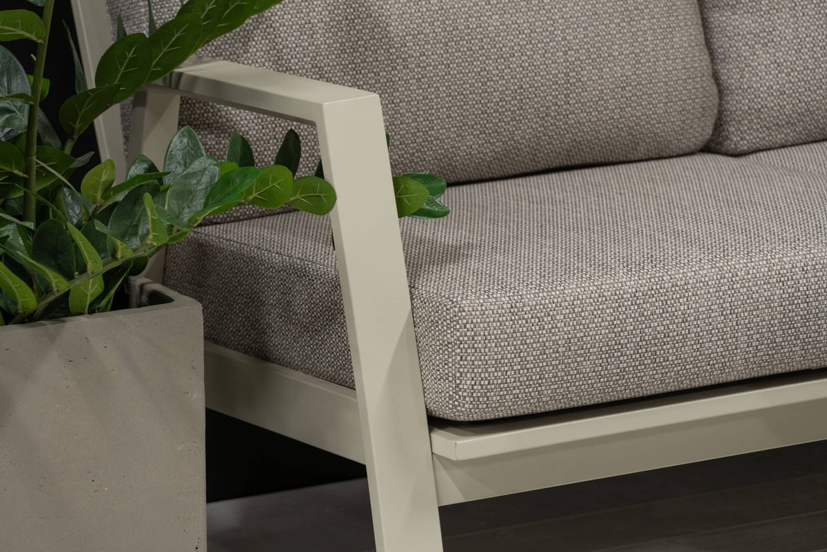 Den pulverlakkerte aluminiumsrammen er kremfarget med skråstilte, kantede profiler.