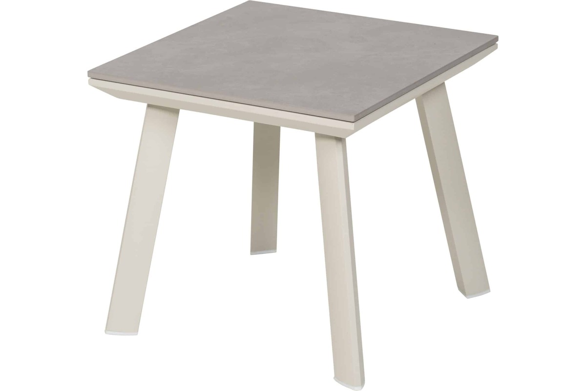 Den pulverlakkerte aluminiumsrammen er kremfarget med skråstilte, kantede profiler.