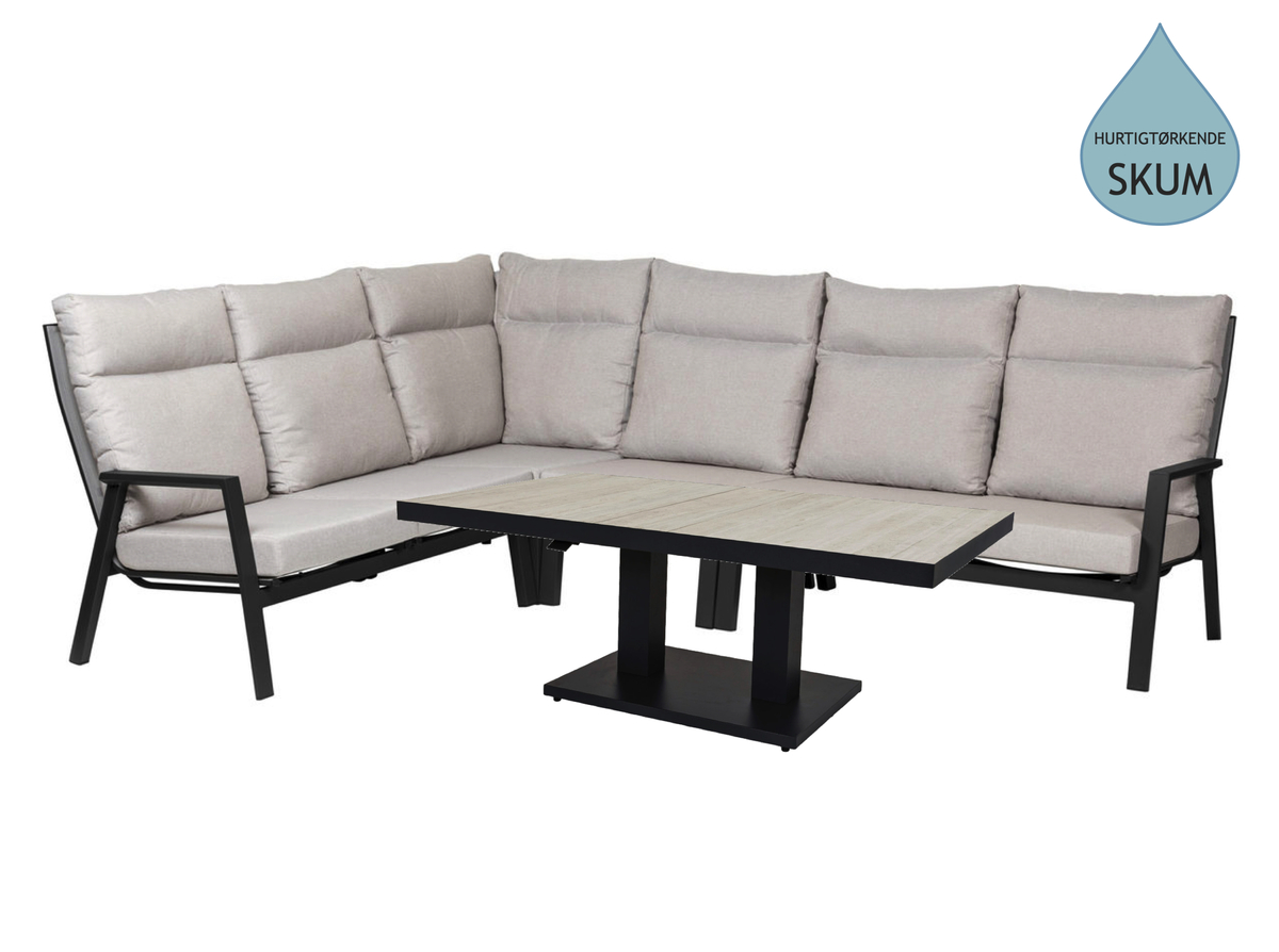 Vendbar hjørnesofa med fantastisk sittekomfort. Laget i sortlakkert aluminium og textilene og med behagelige puter i grå beige Olefin.